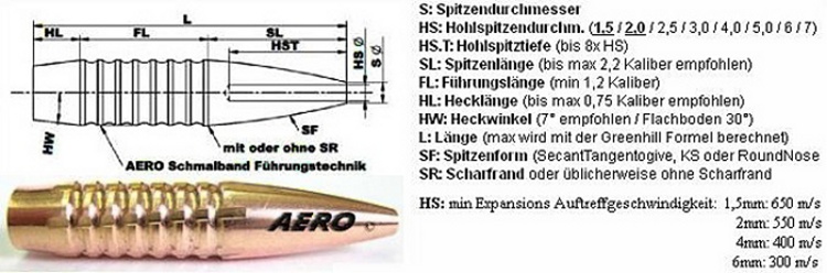 Alle AERO Geschosse haben 0,6mm breite Führungsbänder (sogenannte Schmalband) die sie besonders reibungsarm machen. Dadurch wird der Durchpresswiderstand im Lauf auf ein Minimum reduziert - gleichzeitig wird der Metallabrieb im Lauf auf ein Minimum reduziert und präzisionserhaltende Reinigungsintervalle können "deutlich" erhöht werden. Bei der SB Serie handelt es sich um Deformationsgeschosse mit Hohlspitze.